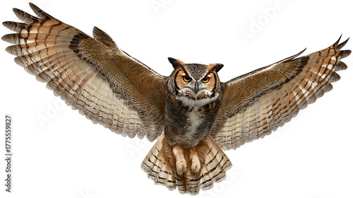 great horned owl flying with wings wide, majestic bird of prey, isolated on white background