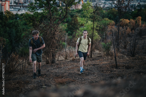 Two men hike up a dry, rocky hillside trail with packs, navigating a forested slope as distant urban buildings peek through trees, conveying outdoor endurance, exploration, and camaraderie.