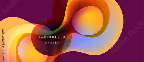 Abstract fluid shapes overlap, creating vibrant color gradients. Purple background complements orange, yellow, blue hues. Modern design element.