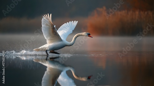 Majestätischer Schwan landet auf spiegelglattem See bei Morgenlicht