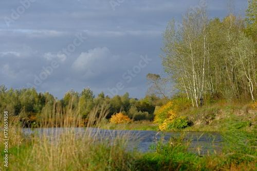 Jesienny krajobraz nad rzeką, złote liście, drzewa i dramatyczne niebo
