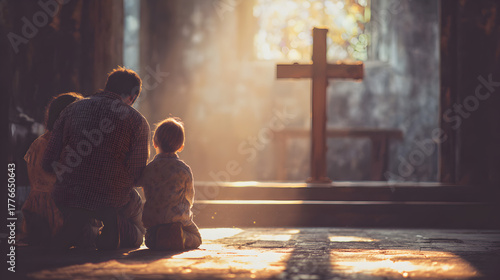 una familia unida hincados a los pies de la cruz dentro de una capilla con la luz del atardecer orando y rezando a Dios con fe y esperanza agradeciendo su bendicion