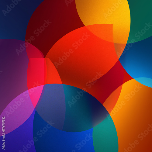 Abstrakcyjna, kolorowa grafika złożona z przeźroczystych okręgów nakładających się na siebie, tworząc nowe odcienie i gradienty. Dynamiczny wzór.