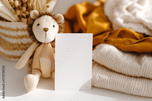 Przytulna aranżacja: miękki, pluszowy lew siedzący obok pustej, pionowej, białej kartki na tle stosu beżowych i musztardowych ubrań dziecięcych.