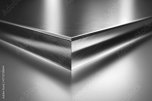 Makro zbliżenie na róg metalowej płyty. Górna powierzchnia jest gładka i odbija światło, natomiast krawędź boczna ma delikatnie szczotkowaną, pionową teksturę.