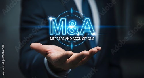 Businessman holding glowing neon sign with ma mergers and acquisitions text, symbolizing business strategy and corporate finance deals