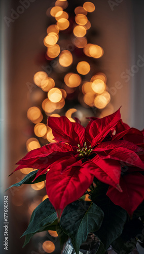 花芯周りの陰影をわずかに強調し立体感を付与したポインセチアが静かな祝祭感を湛える実制作に強い一枚. 生成AI