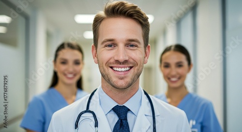 A smiling doctor, exuding confidence and care, stands alongside his dedicated medical team.
