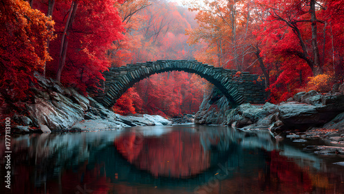 Autumn Stone Bridge: Red Foliage Reflected in Calm River
