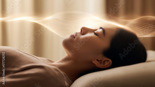 Woman experiencing sound healing therapy with vibrational waves. Audio meditation, relaxation with singing bowls, peaceful wellness treatment for mental and emotional balance, holistic therapy.