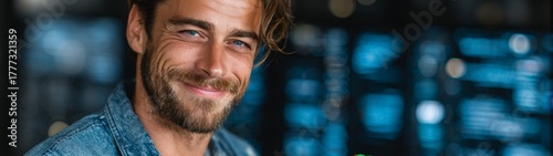 A blend of fashion and positivity: the modern man's charismatic aura. Intelligent screens. Nature and style: harmonious blend of a man’s charisma with colorful surroundings. Digital analytics.