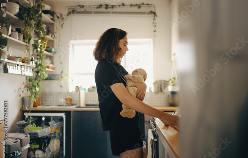 Tired mother holding crying baby while trying to make breakfast
