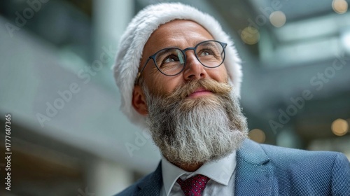 A modern Santa Claus wearing a business suit and a festive hat stands confidently indoors, exuding cheer and warmth. His thoughtful gaze reflects the spirit of the season