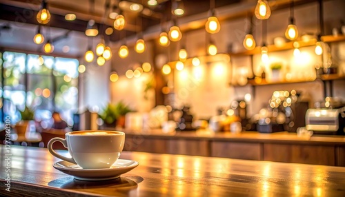 Cafe Scene: A steaming cup of coffee rests on a wooden table, in front of a warm and inviting coffee shop. Lights shine in the background, creating a cozy and pleasant atmosphere.