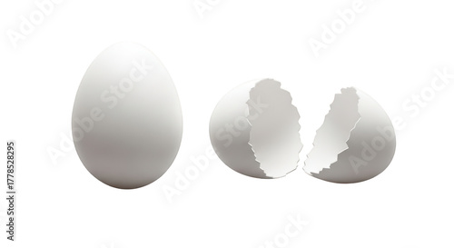 Whole white egg and broken eggshell halves isolated on a transparent background cracked egg