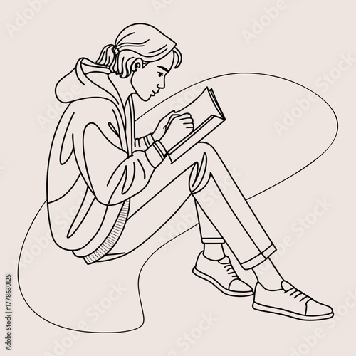 Girl reading a book in line art illustration