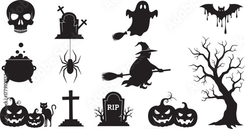 Silhouetted Halloween elements showing witch, ghost, tombstone, pumpkins, skull, cat and bat on a white background