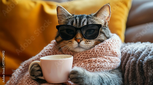 A cat wearing dark glasses and wrapped in a blanket. The cat holds a cup in its paws, creating an atmosphere of coziness and comfort, as if it were resting on a sofa.