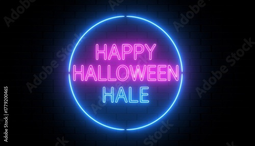 Neon sign displaying "Happy Halloween Hale" within a blue circle against black background.