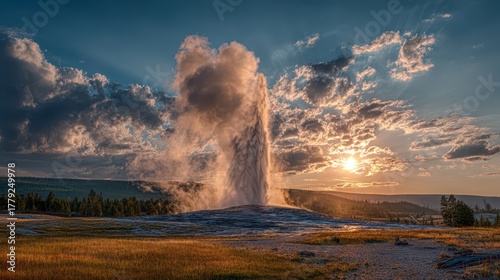 Old Faithful Sunset at Yellowstone National Park - Stunning View of US Landmark