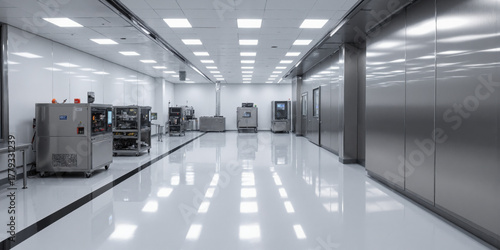 Cleanroom Facility for Electronics A high-precision cleanroom dedicated to electronics manufacturing, with glossy white floors and smooth metal walls. Bright