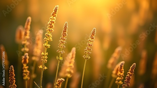 plantago. Plantago ovata plant with slender flower spikes swaying in golden hour light. gardening catalogs, home-decor guides, designed for gardening and botanical catalogs.