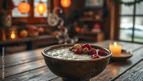 laba. Steaming bowl of Laba porridge with dates and nuts on wooden table. menu design, packaging mockups, designed for culinary blogs and recipe cards for restaurants, supports restaurant marketing.