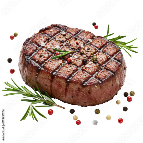 Succulent medium-rare beef steak with char, glistening juices, sea salt, pepper, rosemary, peppercorns on white plate, seamless studio backdrop. Appetizing gourmet concept.