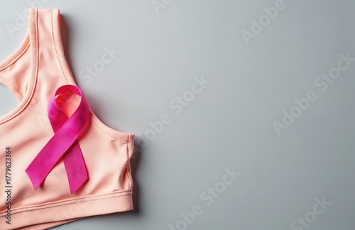 Pink athletic bra with bright pink ribbon on plain grey background. Breast Cancer Awareness Month, representing vital women health, global support, dedicated fight against illness. Powerful image