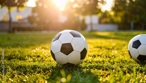 #1779699867A soccer ball with focus on the pentagon pattern, outdoor setting under soft morning light, Minimalist style