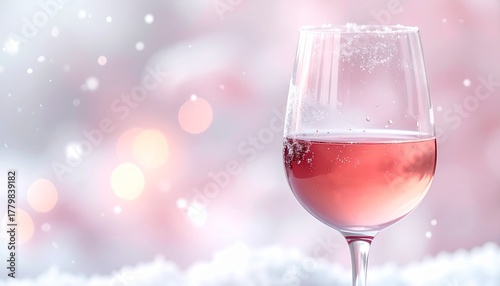 淡いフロストガラスの背景に、やさしいピンクのロゼワイングラスが置かれています。 繊細な雪の粒が舞い、透明感のある冬の上質な雰囲気を演出。 エアリーで洗練された構図が、ラグジュアリーな印象を与えます。