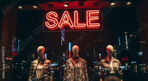 Black Friday Sale Neon Sign in Store Window with Mannequins
