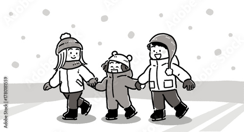 冬にアイススケートをする男の子と女の子のモノトーンイラスト