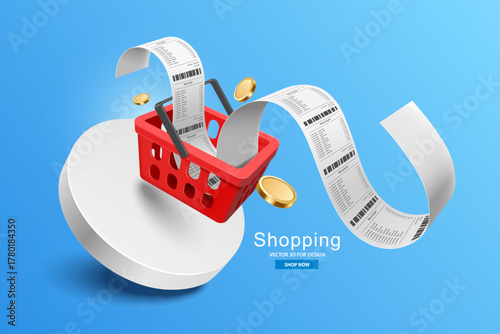 Receipt paper comes out of a red shopping basket and gold or money coins float in mid-air, all floating in mid-air on a white circular podium, vector 3d for e commerce banner advertising design