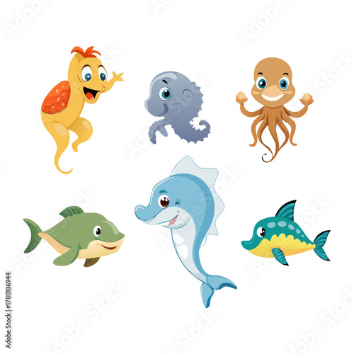 Collection of six cartoon marine animals including a shark, turtle, dolphin, stingray, octopus, and seahorse, isolated on white background