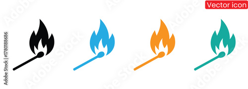 Match fire line icon vector illustration set.Striking matches ignite flames in various colors for innovative designs,Burning matchstick, fire match, matchstick on fire, isolated on white background