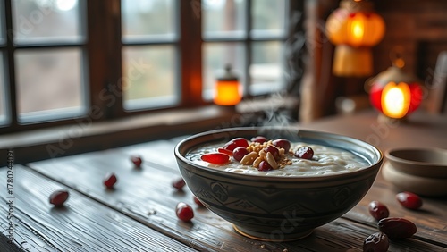 laba. Steaming bowl of Laba porridge with dates and nuts on wooden table. menu design, packaging mockups, designed for culinary blogs and recipe cards for restaurants, supports restaurant marketing.
