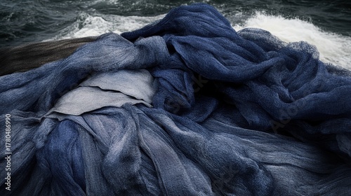 A rich array of deep blue fabric draped across wet rocks beside the restless sea