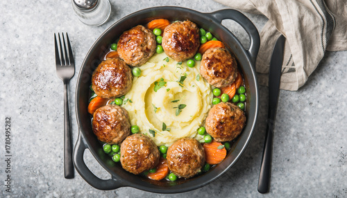Zapiekanka z pulpecikami i purée ziemniaczanym z groszkiem i marchewką
