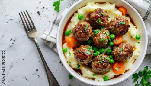 Zapiekanka z pulpecikami i purée ziemniaczanym z groszkiem i marchewką