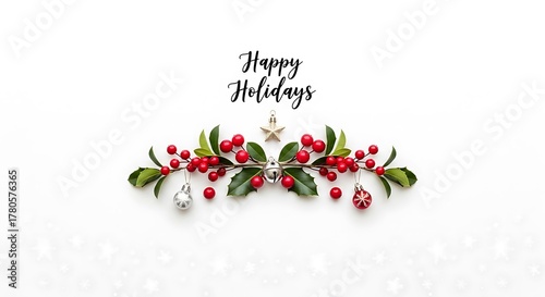 Elegant happy holidays greeting card featuring a symmetrical arrangement of red berries and green leaves with subtle sparkle accents