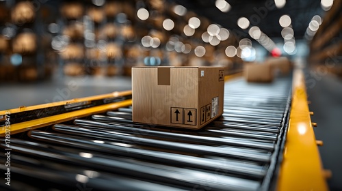 Cardboard box on a conveyor belt in a modern automated warehouse. Background shelving evokes a massive sense of scale and operational efficiency.