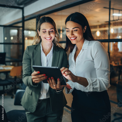 Dwie uśmiechnięte kobiety rozmawiają trzymając w dłoniach tablet