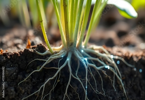Macro of sprouting plant roots in soil symbolizing life growth, innovation, and sustainability in organic technology concept