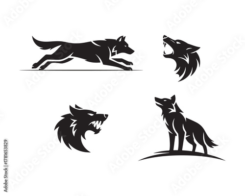 wolf vector silhouette Set, snow mountain silhouette, wolf set collection, wild wolf vector, wolf head vector, mountain landscape vector, wildlife illustration, majestic wolf Collection, wolf emblem s