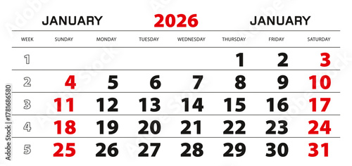 Wall calendar 2026 for january, week start from sunday.