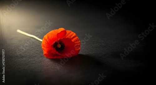 Single vibrant red poppy rests on dark textured surface casting subtle shadow evoking remembrance and solemnity