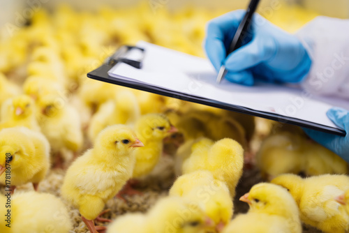 Yellow chicks in a sanitized hatchery enclosure being inspected by a gloved hand with a clipboard. Bird flu (H5N1) biosecurity protocol in place, early health monitoring context