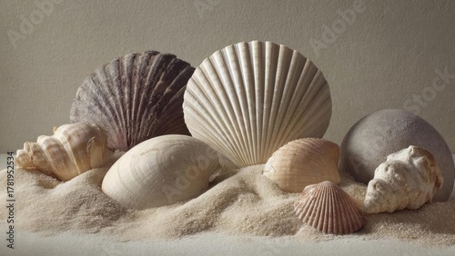 Assorted seashells partially buried in sand on the beach. Concept Seashells on the beach, Beachcombing treasures, Coastal textures, Sand patterns, Ocean finds