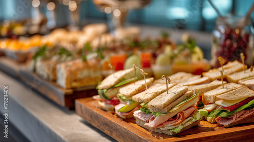 Assorted sandwiches and appetizers displayed on a buffet table for catering